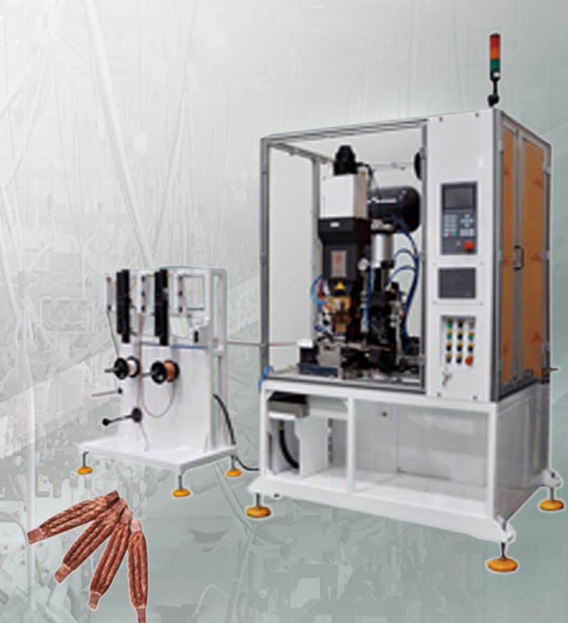 单、多股编织铜线的自动焊接成型、剪断,运用在低压电气、碳刷行业等。