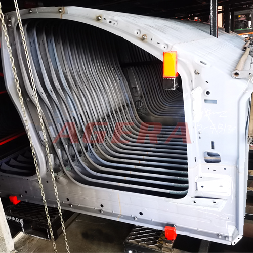 此焊接产品为一体成形门环点焊产品,采用安嘉自动化双焊钳机器人工作站自动点焊补丁板,配以双工位转台,两把机器人焊钳通过仿真按最优路线同步点焊,转台工装采用倾斜形式,满足焊接的同时节省了机器人的运行空间,补丁板焊接后焊核稳定、强度好。